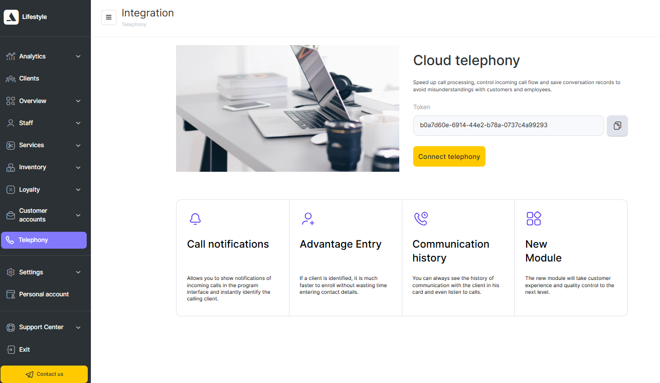 1. In your Altegio account in the upper left corner please find Locations and Chains. Select the network for which you want to set up integration and go to the Telephony section. Copy the telephony token.
