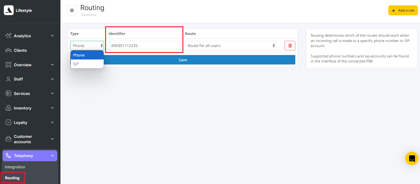 10. In the field that appears, specify the type, identifier and route of the call (by default, it will be Route for all users).