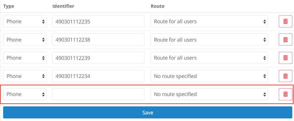 To add a new rule, click the button in the upper right corner. An empty line will be added at the bottom of the list. Enter the phone number and route there.