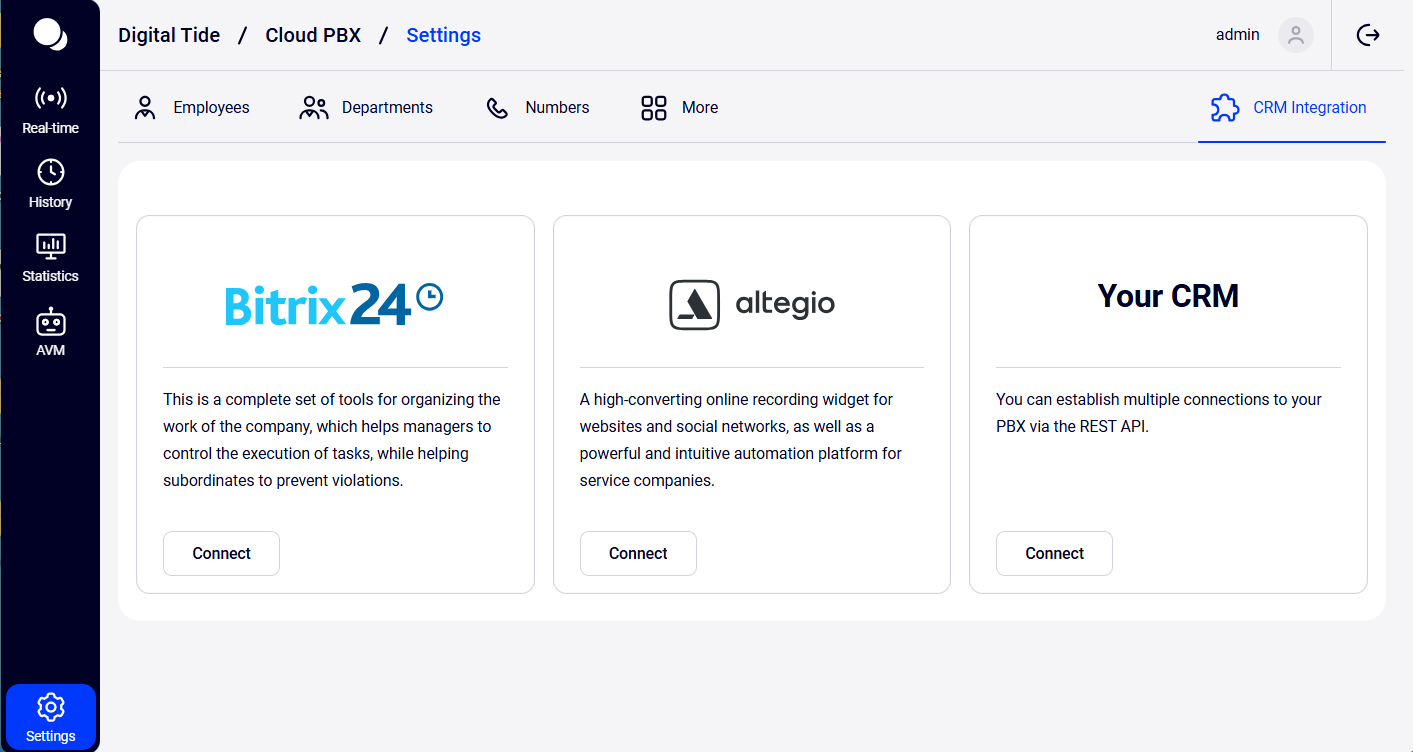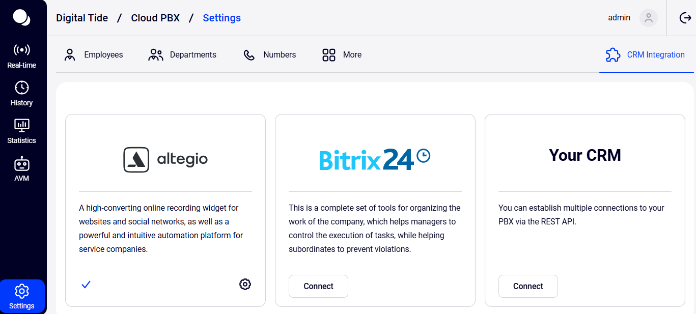 2. Open a new browser tab and go to your Cloud PBX personal account. In the Settings section, select CRM Integration and find the Altegio widget. Click Connect.