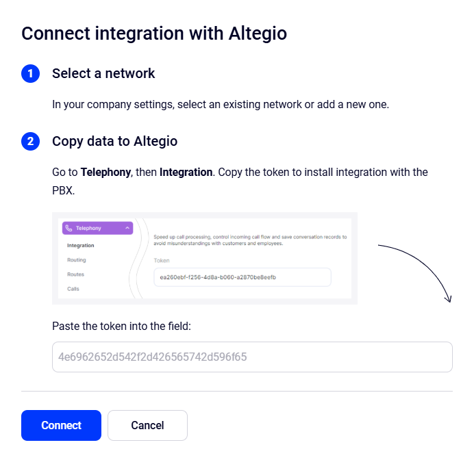 3. In the window that opens paste the token copied from Altegio into the corresponding field. Click Connect.