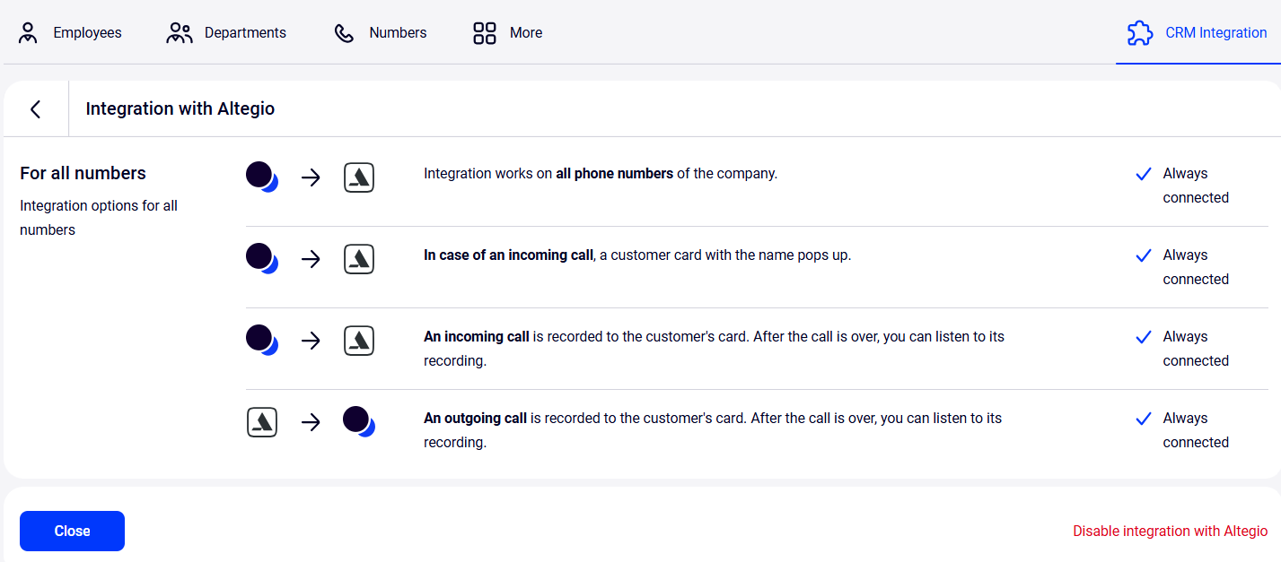4. In your Cloud PBX personal account you will see the “Settings have been saved” message. After that the options of the installed integration will open. To finish the setup, click Close at the bottom of the screen.