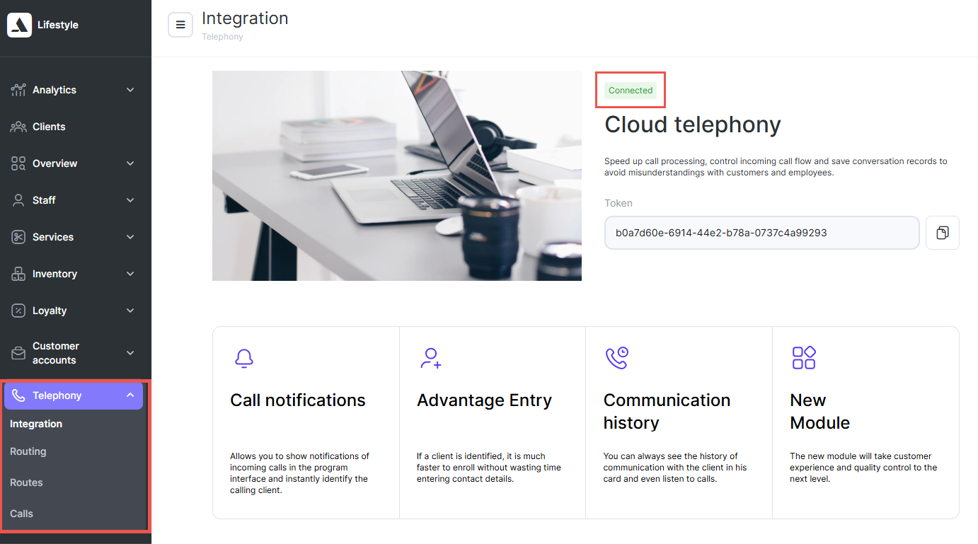 6. Go to Altegio. After the setup is completed, additional sections will appear in the Telephony menu in your Altegio personal account: Integration, Routing, Routes and Calls. The integration status will change to Connected.