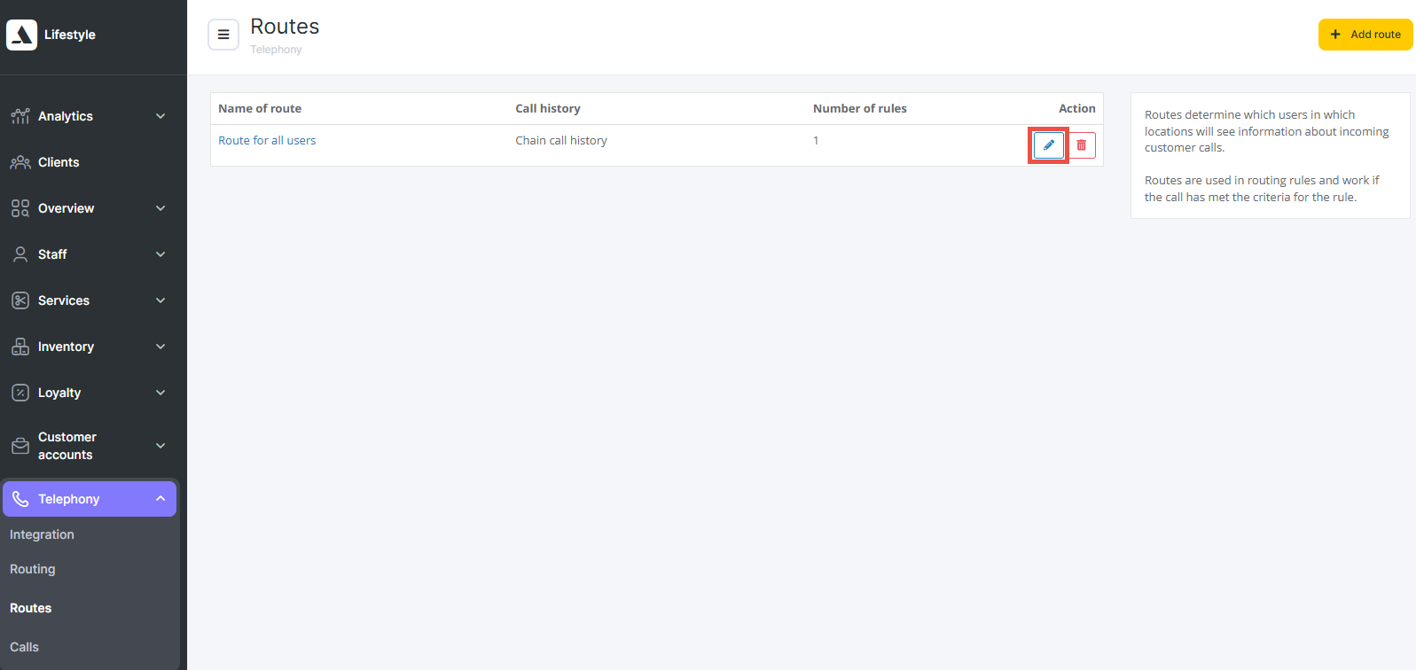 7. Go to the Routes section and make sure that Route for all users is selected, which is where the call will go. To view and change the settings, click the Edit button.