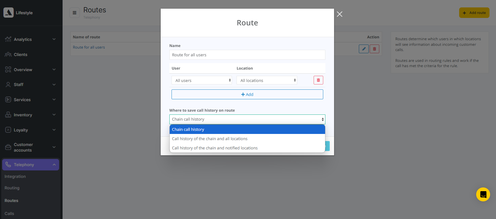 8. By default, all the call history for the route will be saved in the Chain call history. You can select where exactly to save the call history for the route: