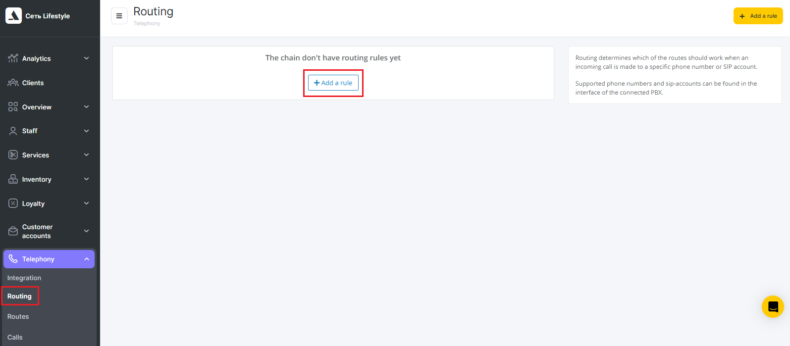 9. After setting up the route, link it to the phone number / telephony subscriber ID where calls should be received. To do this, go to the Routing section. You will see the message: “The chain don't have routing rules yet” Click the Add a rule button.