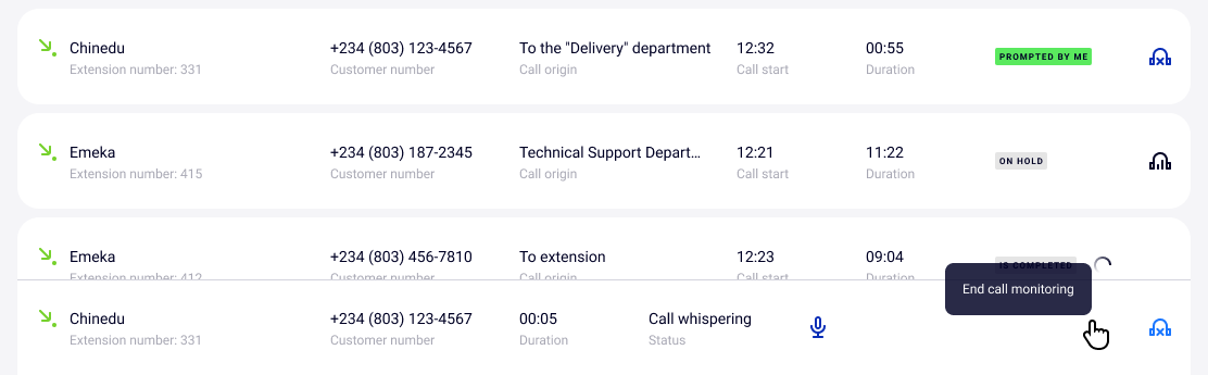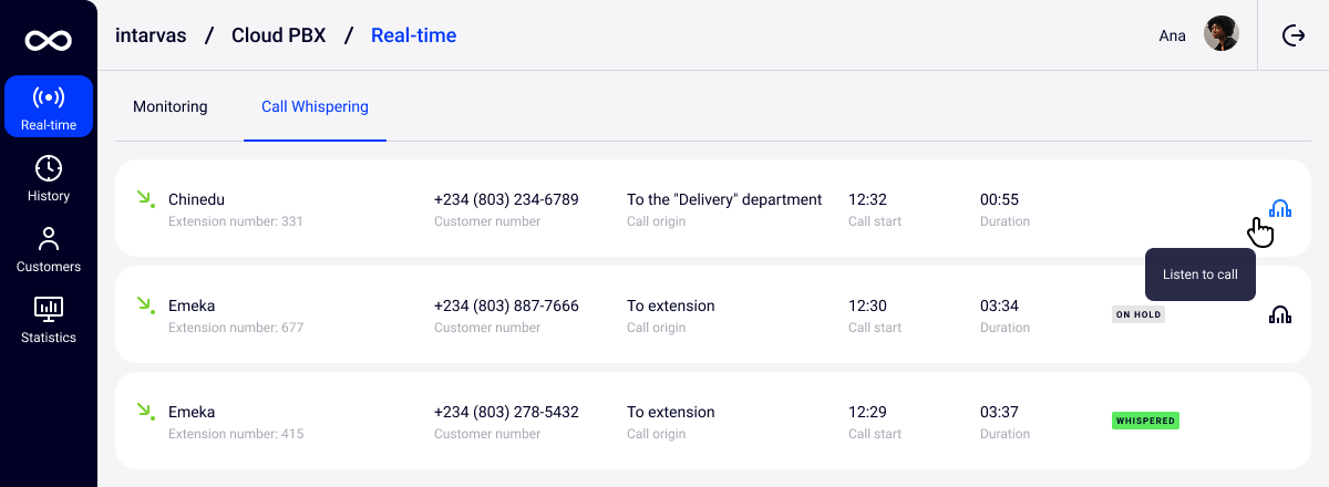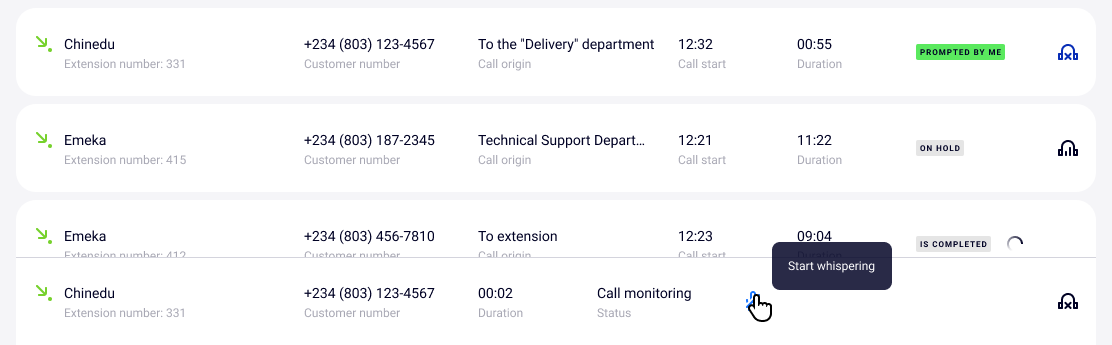 To find out which employees are currently talking on the phone and with whom they are talking, go to the Call Whispering tab and select a call with the headphone icon on the right.