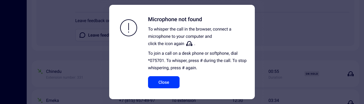 Please note: you can listen to and whisper a call through the interface only after connecting a microphone to your computer. Otherwise, when you click the headphones icon, the following notification will appear: