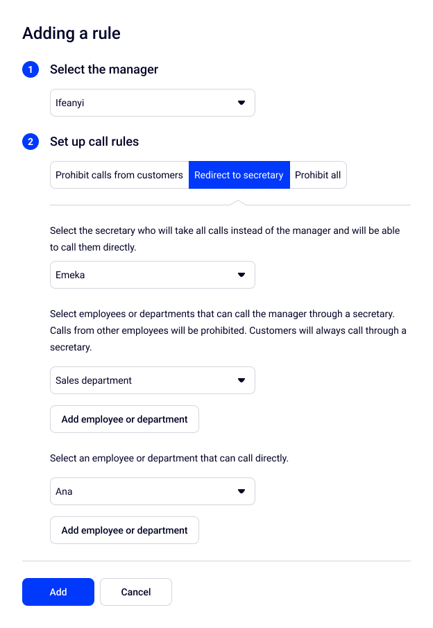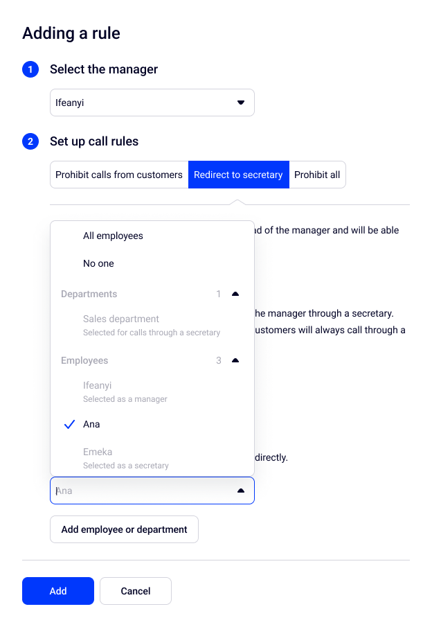 Then, select departments and employees who will be able to call the manager through the secretary — calls from other employees will be prohibited.
