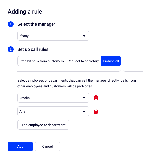 - Prohibit all from calling the manager. You can add exceptions — select employees who will continue to call the manager directly.