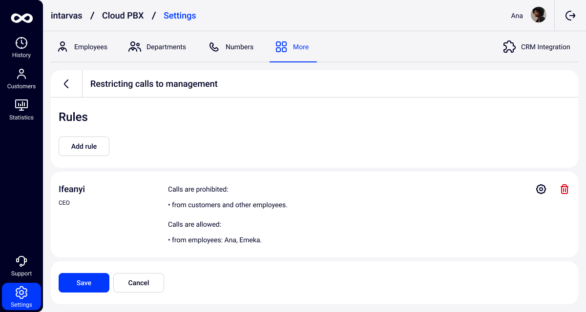 - Prohibit calls from customers — only employees will be able to call the manager via Cloud PBX. This is the default option.