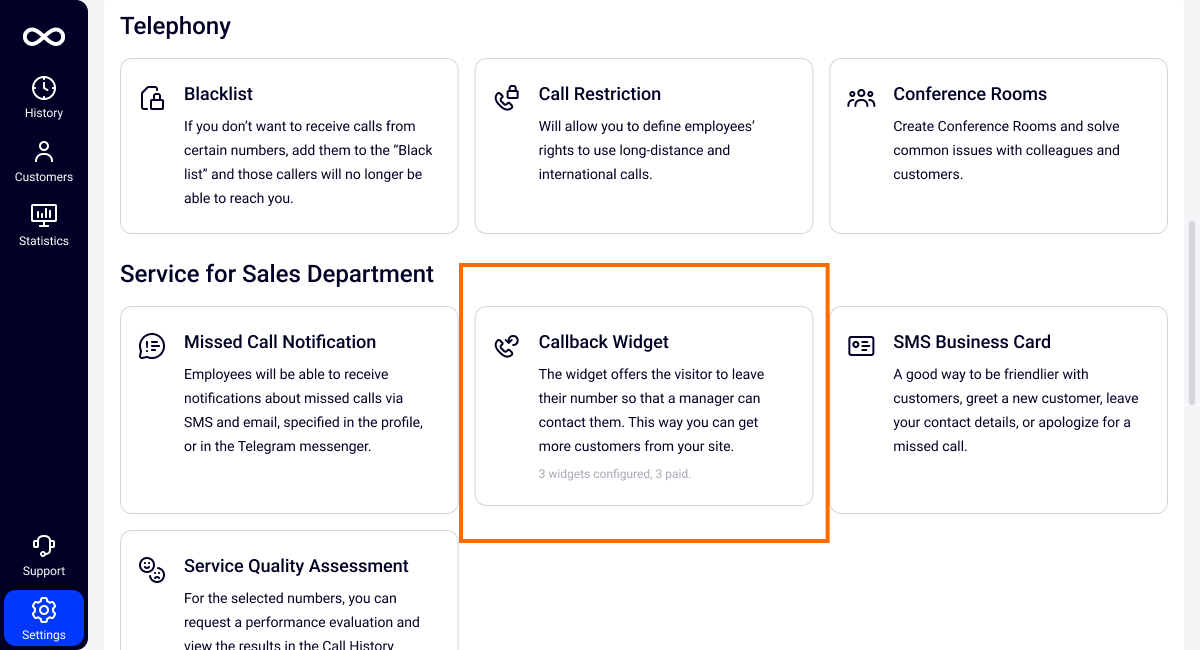 You can request a call back from the website only to a cell phone number of your country’s telecom operator. If you have added a subscriber's number to the black list, they will not be able to call you, even if they request a call back through the widget on the website — Cloud PBX won’t let unwanted calls through.