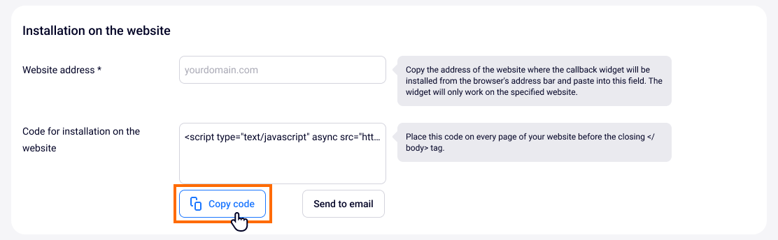 10. Copy the code for installing the widget on the website and send it to your webmaster. You can also paste the code on your website yourself (the place where you need to paste the code is specified in the comments to the Code for installation on the website field in your personal account).