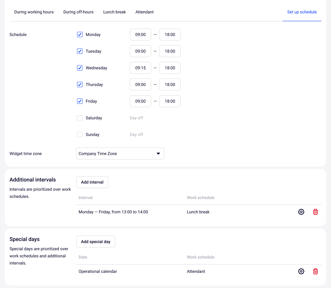 The widget schedule settings have the same capabilities as the number schedule settings. Therefore, to customize the widget according to your schedule, we recommend that you read the Flexible schedule settings for a number article.