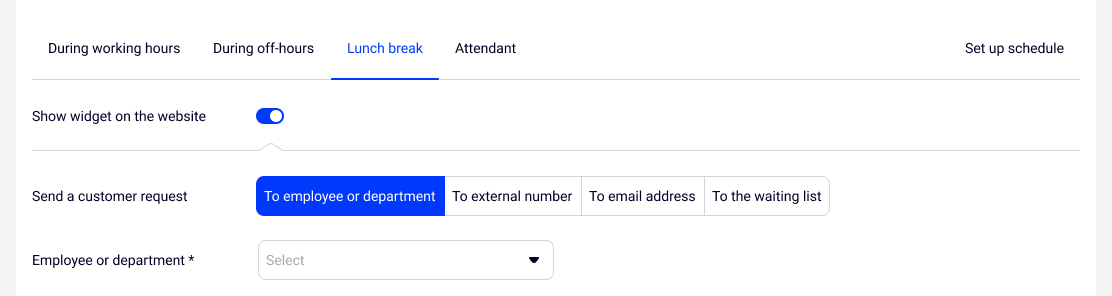 3. Specify the schedule for your managers to receive calls during working and non-working hours. Select employees or departments to answer calls requested through the callback widget.