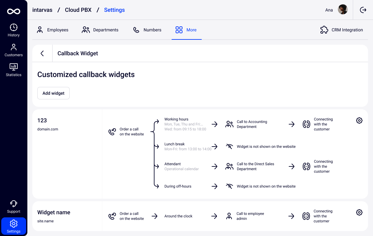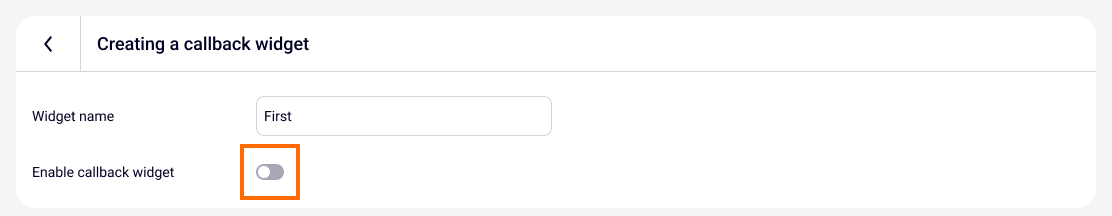 In the appeared window at the bottom of the page click Add widget. Next, you will be taken to the window for creating a callback widget. Specify any widget name and turn on the Enable callback widget switch to open its settings.