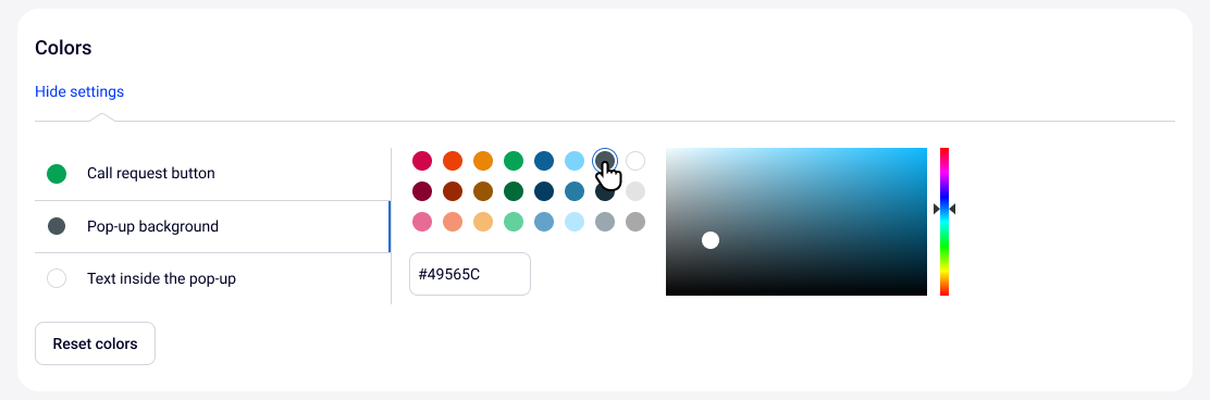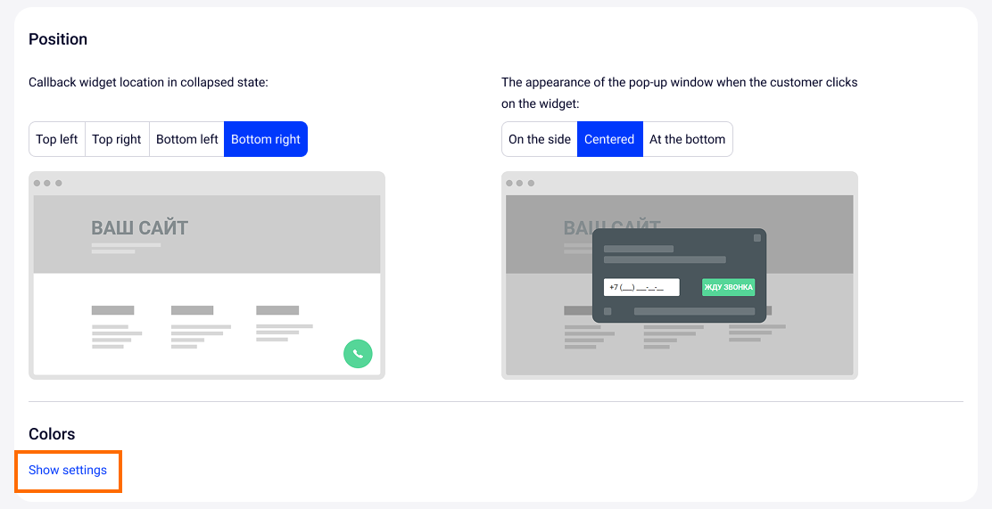 Choose the color for the call request button, the background of the pop-up window and the text inside it. You can choose colors to match your corporate style or make the widget stand out on your website pages.