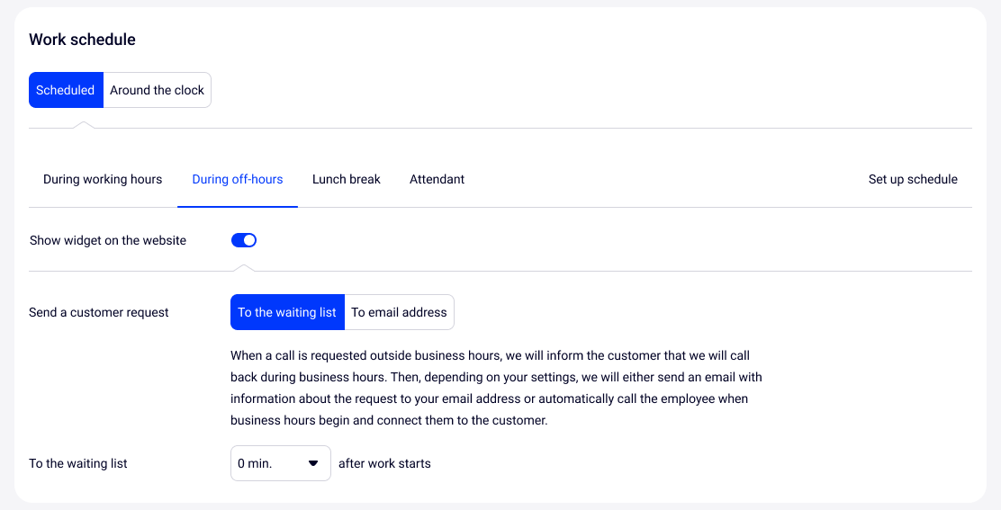 11. Save the changes. using the call reception scheme, check that you have set up the widget schedule correctly. Prepare your employees to receive calls requested through the widget.