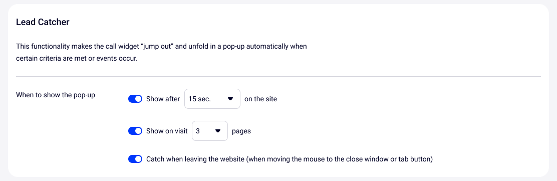 7. Set up the Lead Catcher feature so that a pop-up window with an offer to request a callback from the website appears automatically when a visitor stays on the website longer than a certain time period, has already viewed several pages or wants to leave the site.