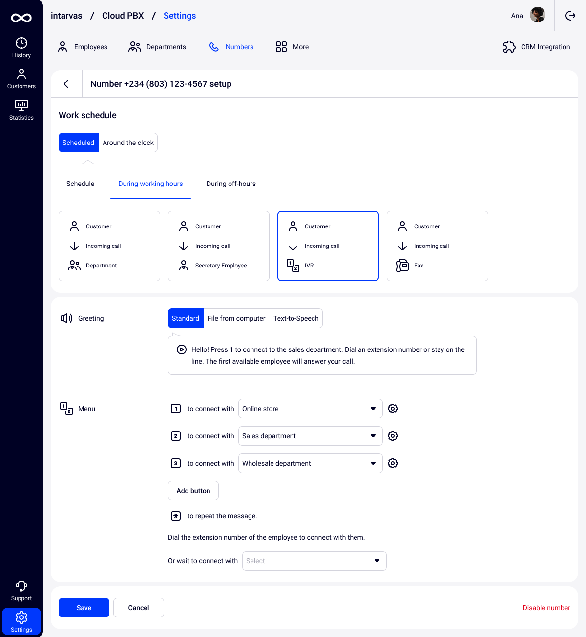 Once a customer dials a specific digit in tone mode, the IVR connects them to an appropriate specialist. If the customer knows the employee's extension number, they can dial it during the voice greeting. If they don't know it, Cloud PBX will announce all the options where their call can be directed. Only if the customer becomes confused and doesn't click any buttons, the system will connect them to an operator.
