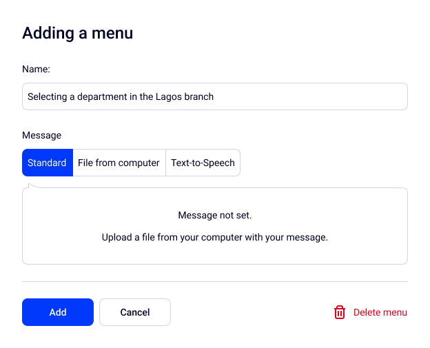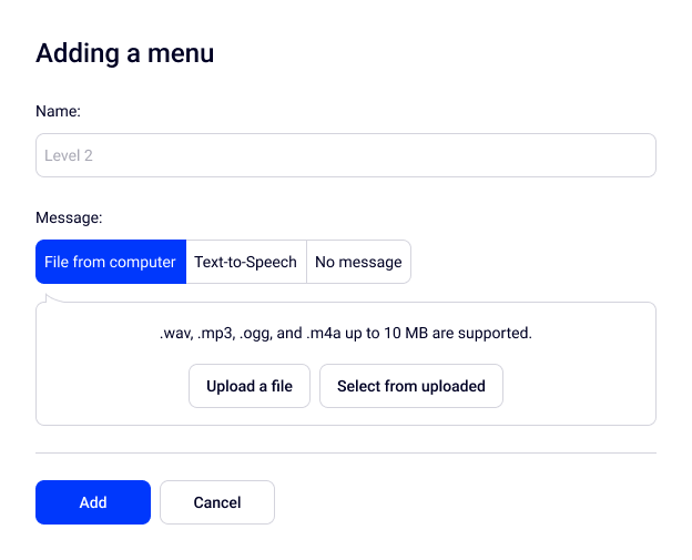 4. The voice greeting is configured separately for each menu level. Select the greeting for the second level and click Add.
