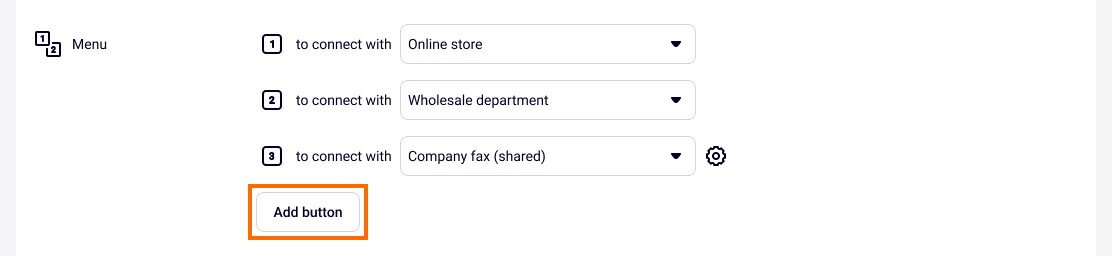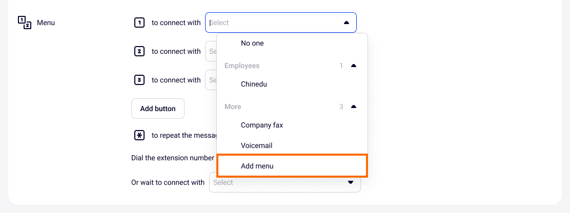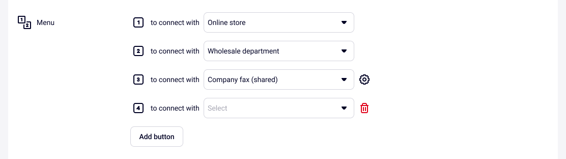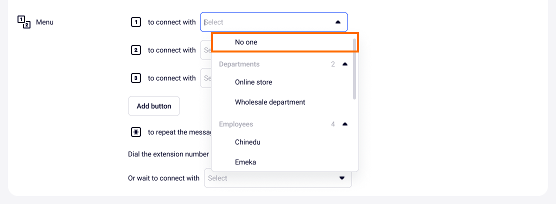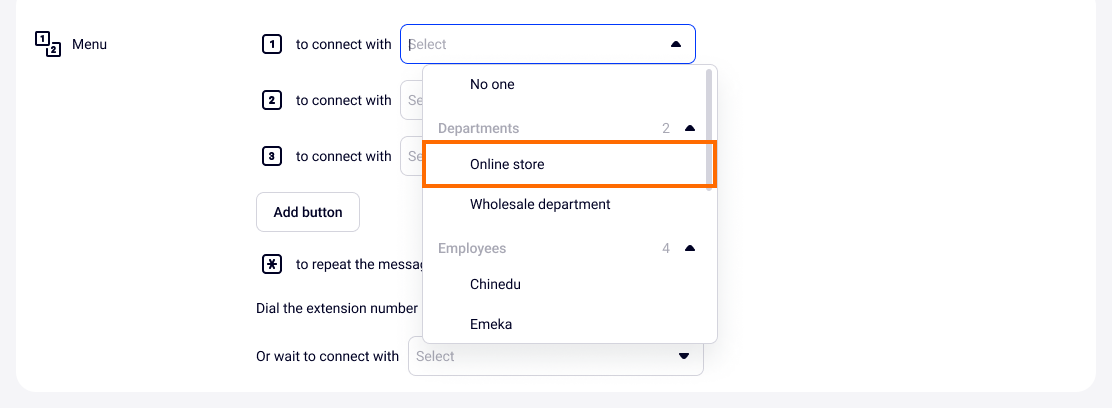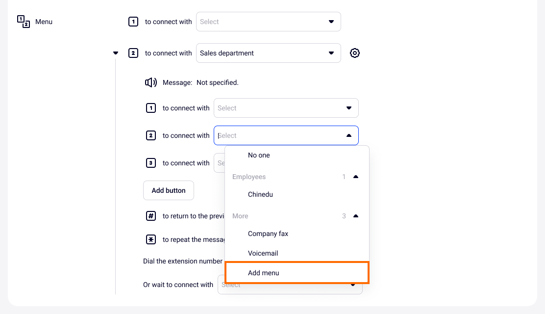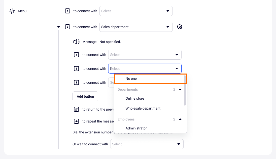 1. To configure the first level of the menu, specify where the call should be directed when each button is clicked. For example, if you want the Sales department to answer the call when button 1 is pressed, open the dropdown list next to the text “1 to connect with…” and select Sales department.