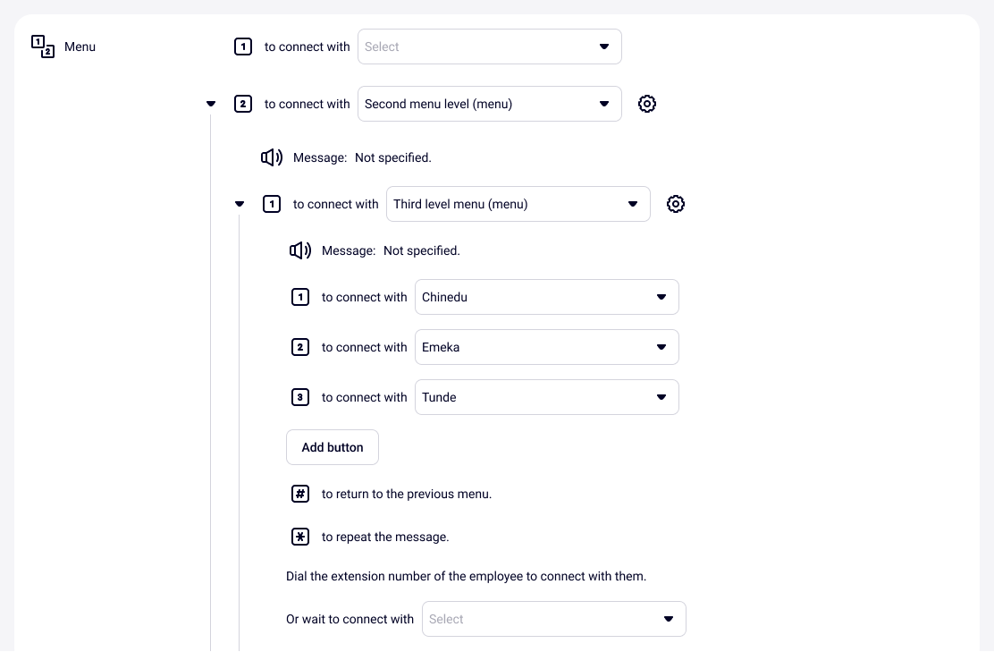 For instance, when you select Third level again from the dropdown list, all the level settings will be displayed such as voice greeting, button distribution, and any nested levels within it.