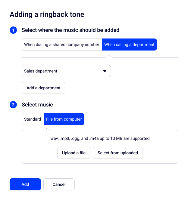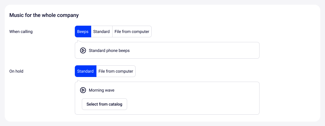 In the catalog of standard melodies, you can choose the music that will play when calling company numbers and departments. Cloud PBX offers 7 standard melodies now.
