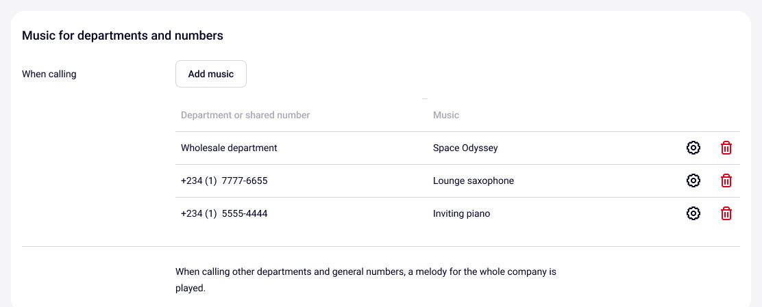 To change the music for a department, click the gear icon located to the right of the department name and music. To remove the music settings, click the trash bin icon.