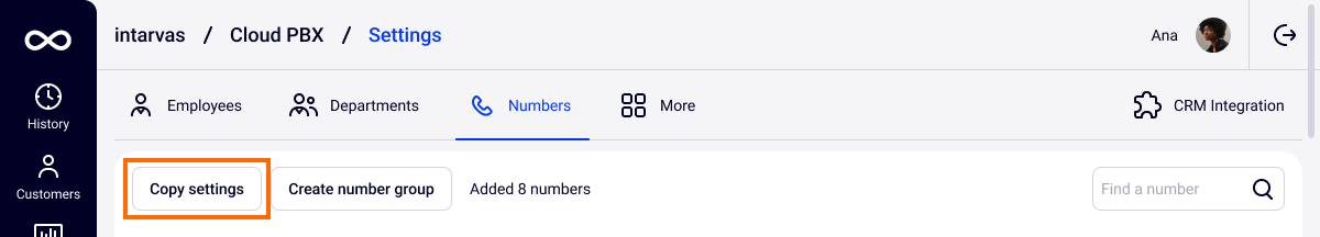 1. Go to the Settings section on the Numbers tab. Click the Copy settings button.