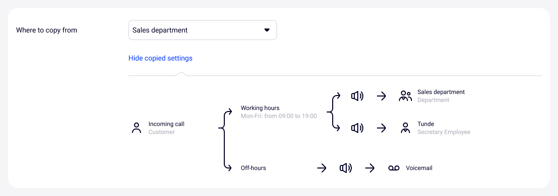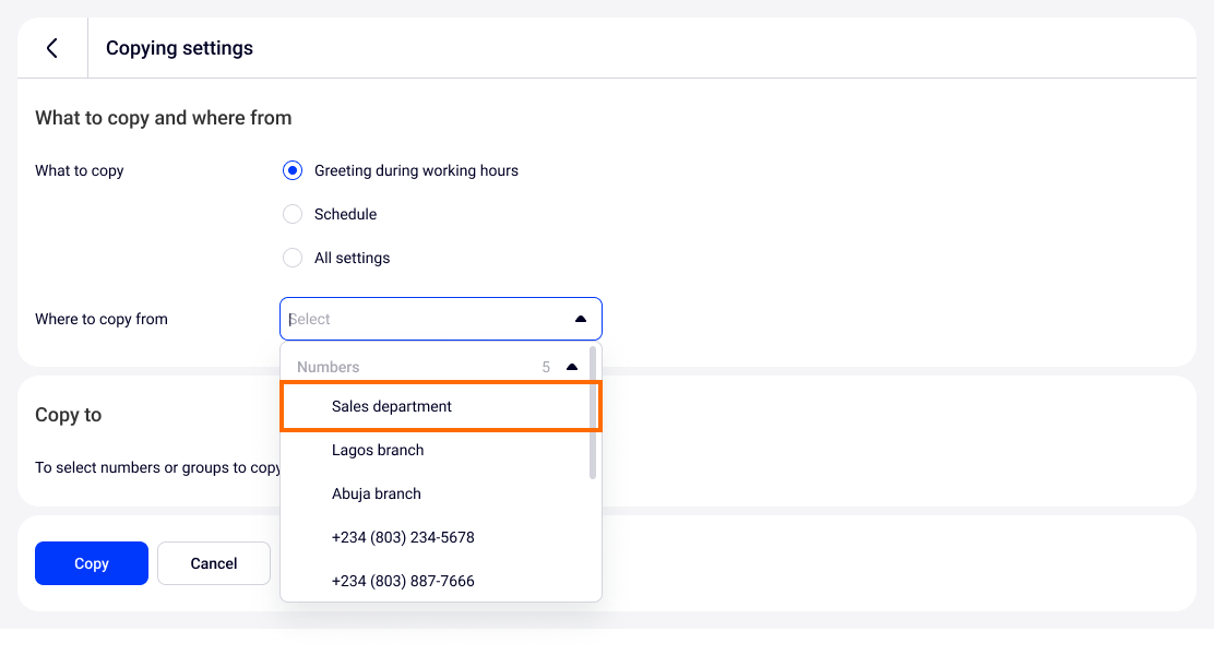 Below you will see and be able to check the settings you want to copy to another number: the call reception scheme, work schedule or greeting settings.