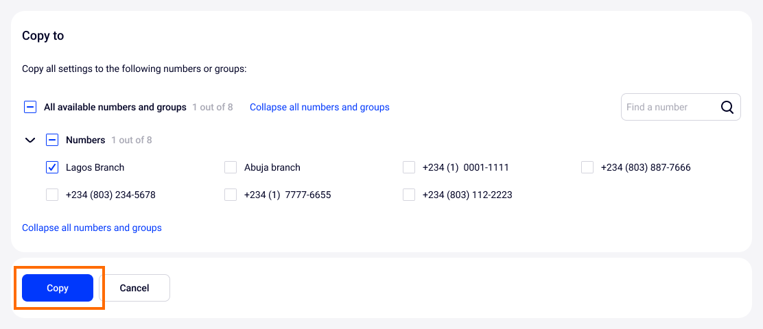 4. Check the boxes where you want to copy the number settings to. You can copy the settings to individual numbers, as well as to groups of numbers.