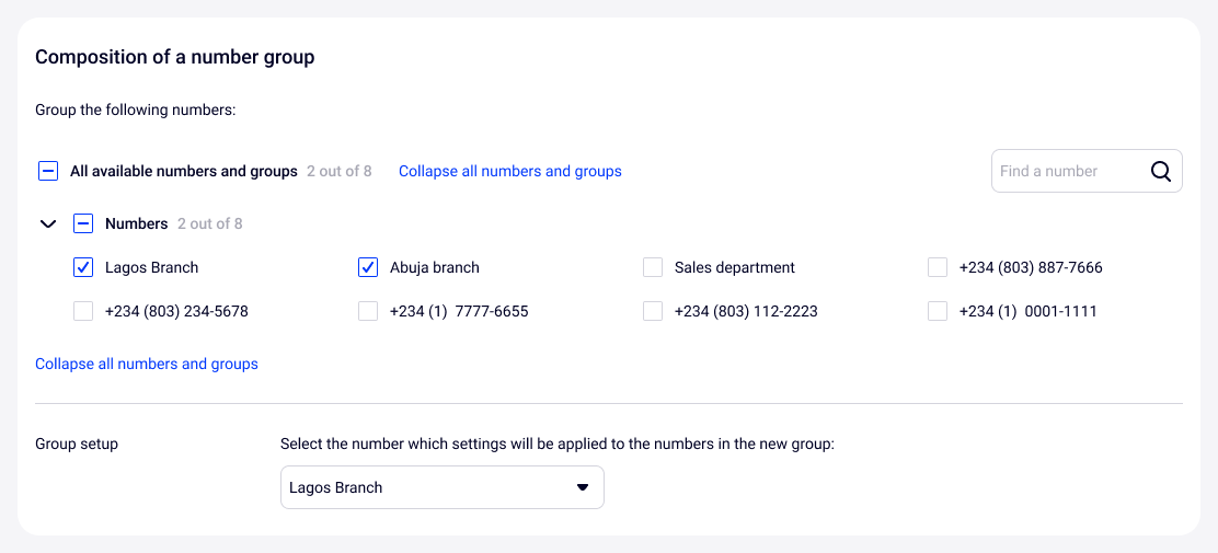 Only those numbers that are not already in other groups can be included in this group. If you want to add to the group all numbers that are not in any of the previously created groups, click the checkbox next to the All available numbers heading.