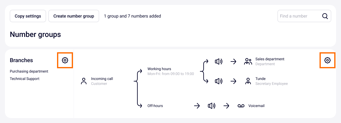 • if you need to change the rules for receiving calls, the schedule, the greeting in the number group, click on the gear icon to the right of the call reception scheme.