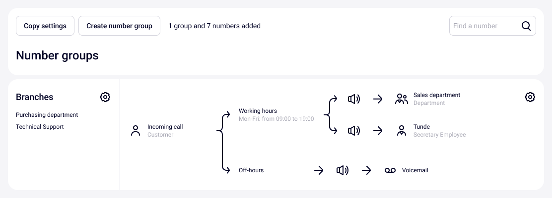 If you have many numbers that work the same way, you don't have to go into the settings of each number separately to change the schedule or greeting. Cloud PBX allows you to save time and edit any amount of numbers in bulk — you can combine numbers into groups with the same settings or copy the number settings.