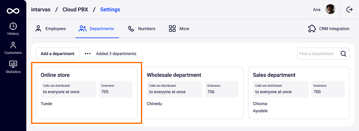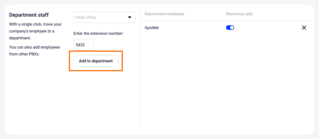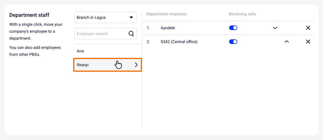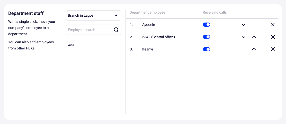 4. You can change the order in which employees from other PBXs receive calls, temporarily exclude them from this queue or completely remove them from the department, just like any other Сloud PBX employee.
