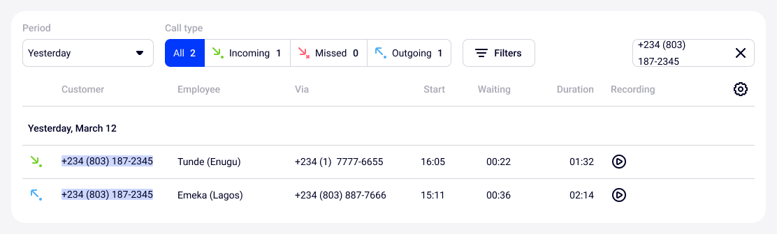 Now, your department calls, which were received or made by an employee from another PBX, will be displayed in your History and their recordings can be listened to. In the Employee column, the name of the branch to which the employee belongs will be displayed in brackets, and in the Via column — the number of the Cloud PBX in which the department with this manager is set up.