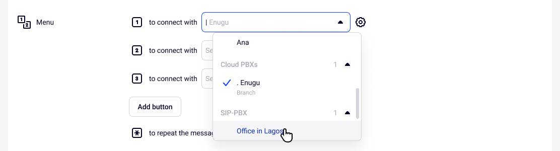 2. Open the drop-down list next to the button you want to assign to forward calls to an employee from another PBX. Find the Cloud PBX section in the list if you want to make an employee from another Cloud PBX available through the IVRu. If you want to add an extension number of a SIP-PBX employee, find the SIP-PBX section.