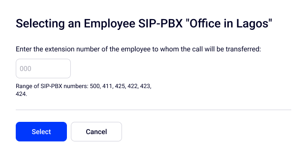 - If this is a SIP-PBX, then enter the employee’s extension number. So that you do not have to look for this number in the SIP-PBX settings, the entire range of available numbers for the selected PBX is listed under the number entry window.