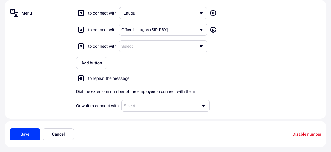 You can add an employee from another PBX to the IVR — to contact them, dialing an extension number or selecting a call direction will be needed. For this: