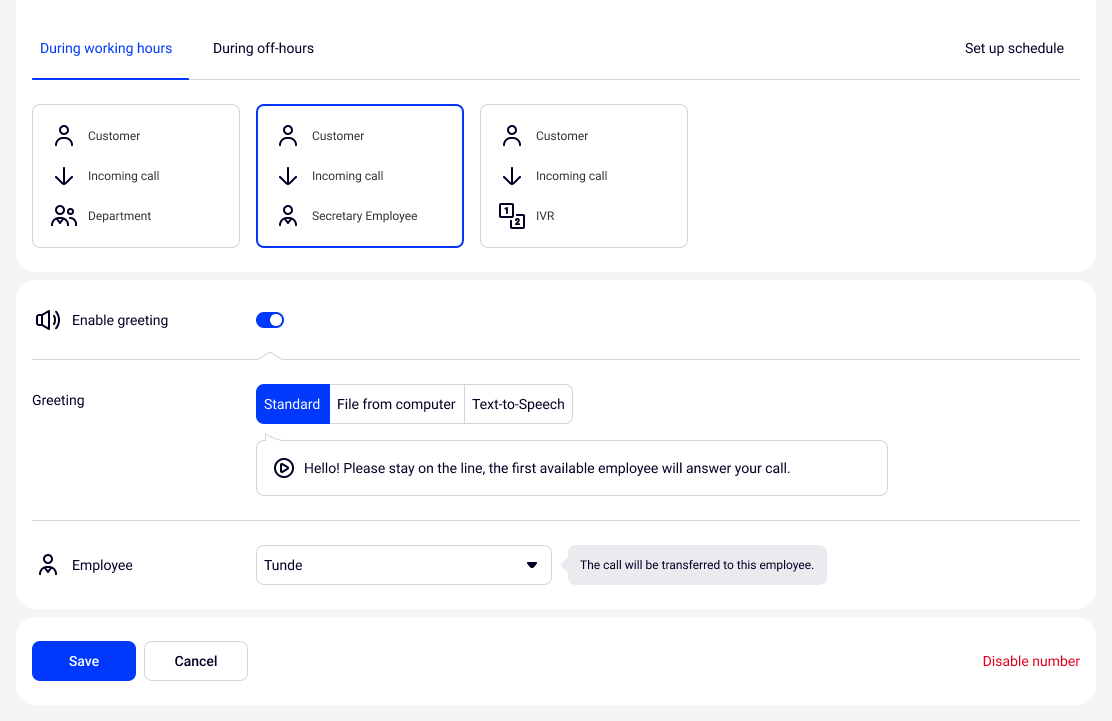 1. In the number settings select the Scheduled operating mode and go to the During working hours tab. Select the scenario: Customer — Incoming call — Secretary Employee.