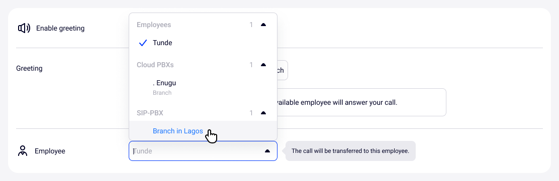 - If this is a Cloud PBX, then select an employee from the drop-down list.