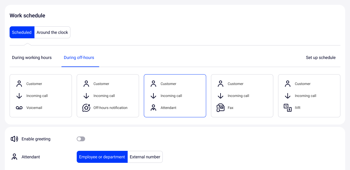 1. In the number settings, select the Scheduled operating mode and go to the During off-hours tab. Select the scenario: Customer — Incoming call — Attendant.