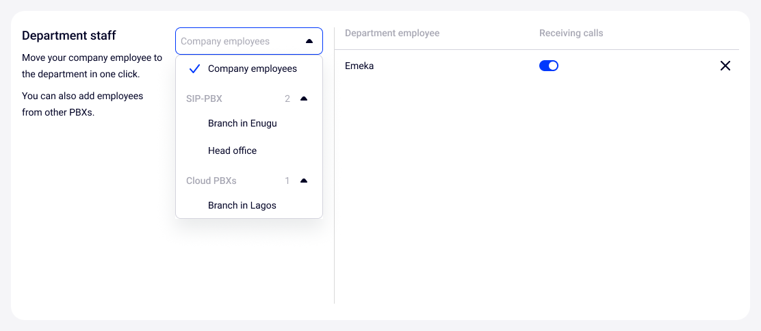 2. In the Department staff section select the required office or Cloud PBX from the drop-down list.