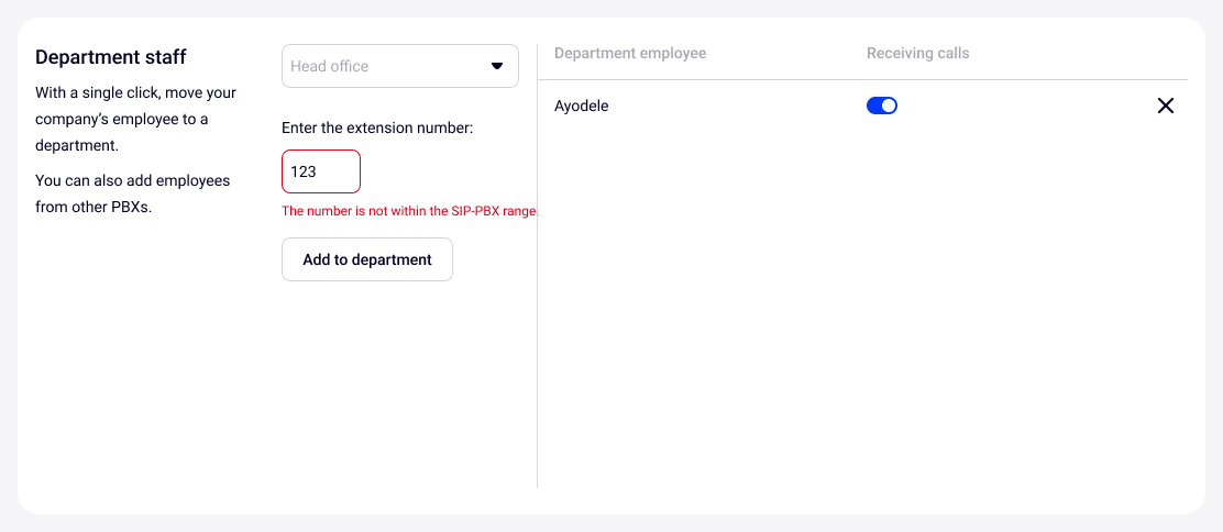 1. When you select a SIP-PBX, a window for entering an extension number will appear below. Enter the number of the employee you want to add and click the Add to department button.