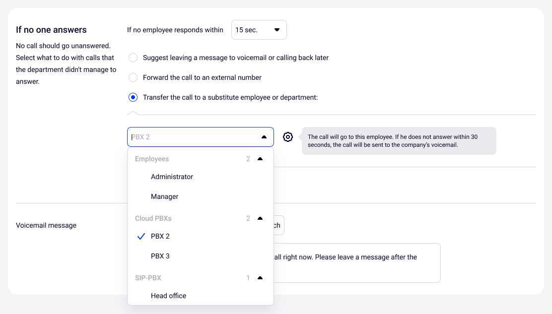 When department employees don’t answer within a certain amount of time, the call can be transferred to a substitute employee or department. To do this, in the department settings in the If no one answers section, you need to select Forward the call to a department or a substitute employee. To use an employee from another PBX as a substitute one, specify another PBX in the drop-down list.