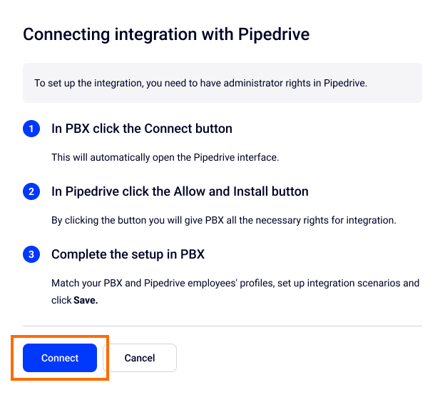 1. In your Cloud PBX, go to the Settings section and open the CRM Integration menu. Find the Pipedrive widget, click Connect and follow the instructions.