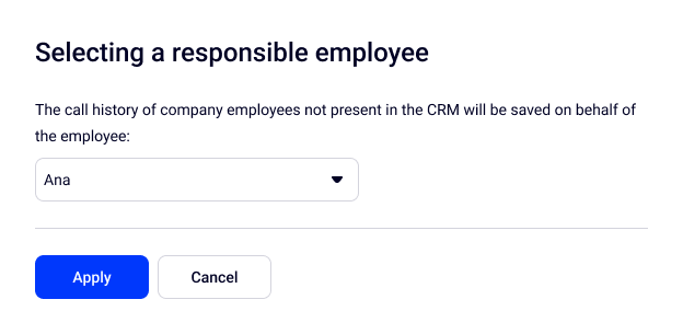 You can set up what to do with the call history of the Cloud PBX employees who are not added to Pipedrive. You can save their call history on behalf of any matched user.