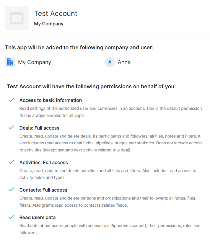 4. A list of permissions required for the integration to work will open. Cloud PBX requests access to basic information about users authorized in Pipedrive, deals, activities, contacts, leads, account administration, the ability to listen to call recordings, information about user rights, etc.