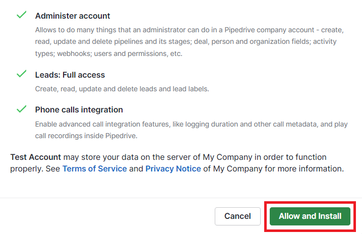 Scroll to the bottom of the list. To allow Cloud PBX access to Pipedrive and install the integration, click the Allow and Install button.